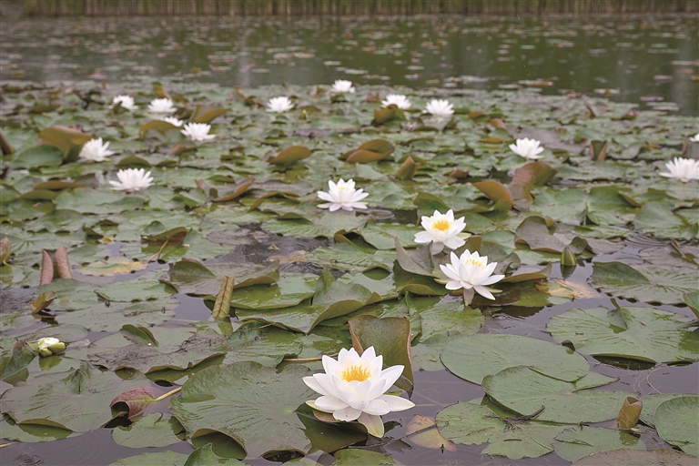 谷雨时节,湘湖定山路一带的睡莲悄然绽放,红的、白的、粉的,宛如颗颗璀璨明珠,镶嵌在碧波之上。